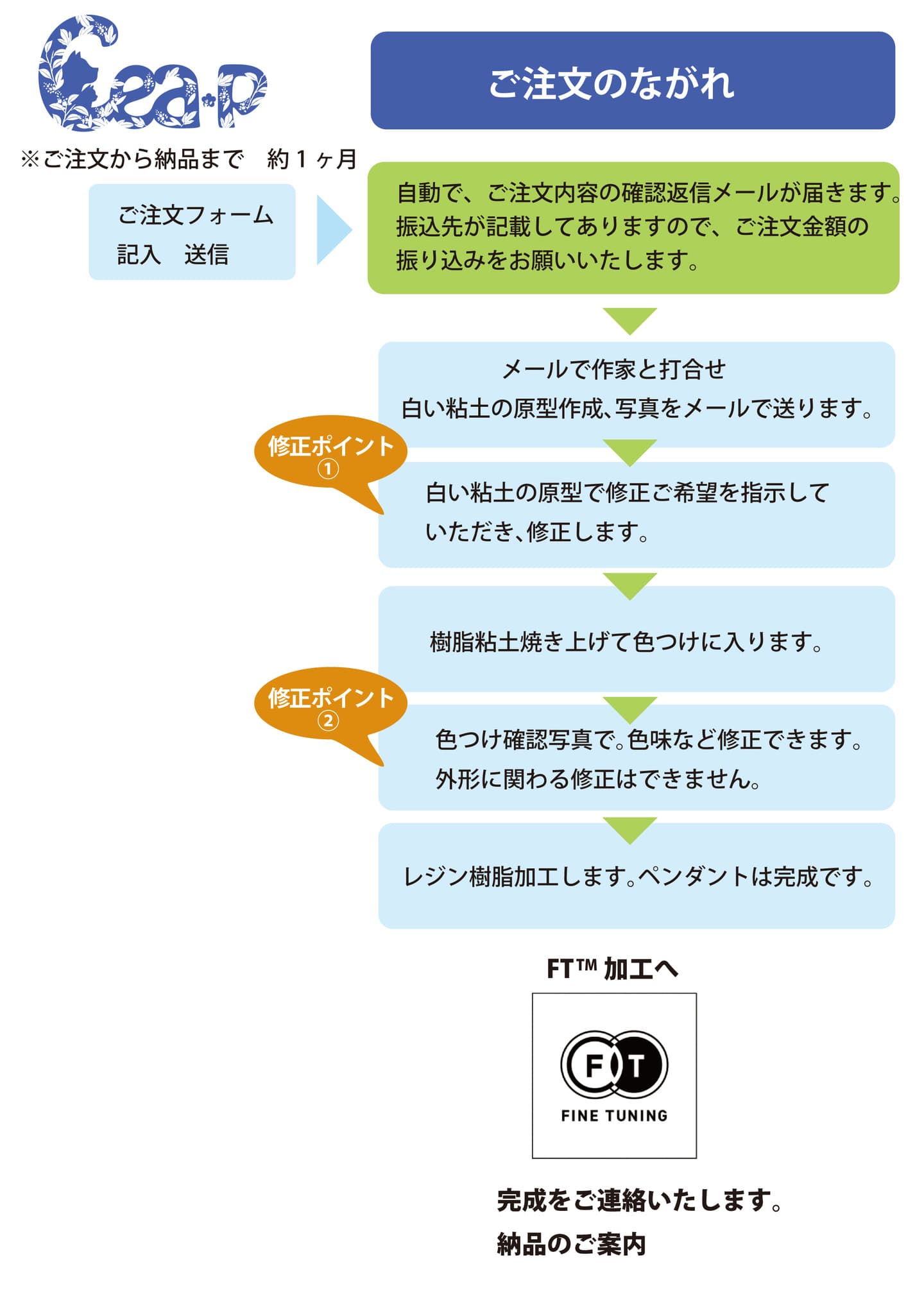 ご注文フォームに細かく記載いただき、発注後にメールでご連絡いたします。